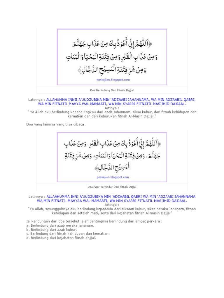 Bila seseorang selesai membaca tashahhud akhir hendaklah ia memohon perlindungan kepada allah empat perkara iaitu. Doa terhindar dari fitnah dajjal fitnah dajjal adalah fitnah terbesar semenjak allah menciptakan adam hingga hari kiamat. Semua orang tentunya ingin terhindar dari fitnah dajjal karena fitnah dajjal merupakan salah satu fitnah terbesar sejak nabi adam diciptakan hingga akhir zaman nanti.