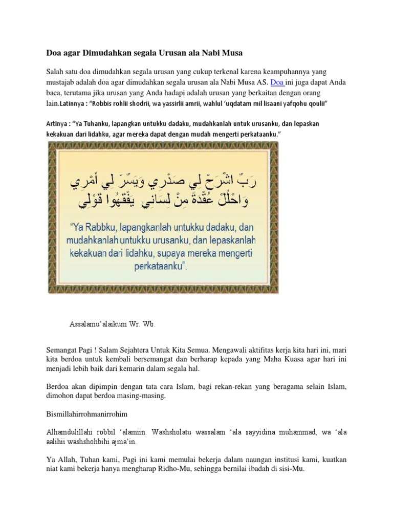 Doa agar dimudahkan segala urusan dan ucapan. Doa mustajab agar dimudahkan segala urusan dan ucapan ini dia terdapat ada satu doa mustajab supaya dimudahkan urusan maupun ucapan perkataan. Doa ini dari nabi musa alaihis salam. Dan untuk lebih jelasnya berikut ini 6 bacaan doa agar dimudahkan segala urusan lengkap tulisan arab latin dan terjemahan bahasa indonesianya.