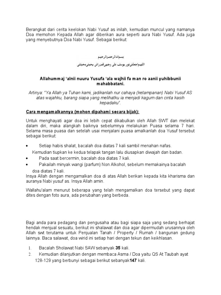 Informasi lebih lanjut tentang. Doa nabi yusuf saat bercermin dan berhias diri pria dan wanita doa nabi yusuf biasa diamalkan seseorang untuk memancarkan aura wajah untuk menampakkan aura pengasihan dan untuk membuka pancaran daya tarik seseorang. Baik menarik di mata wanita ataupun di mata pria.