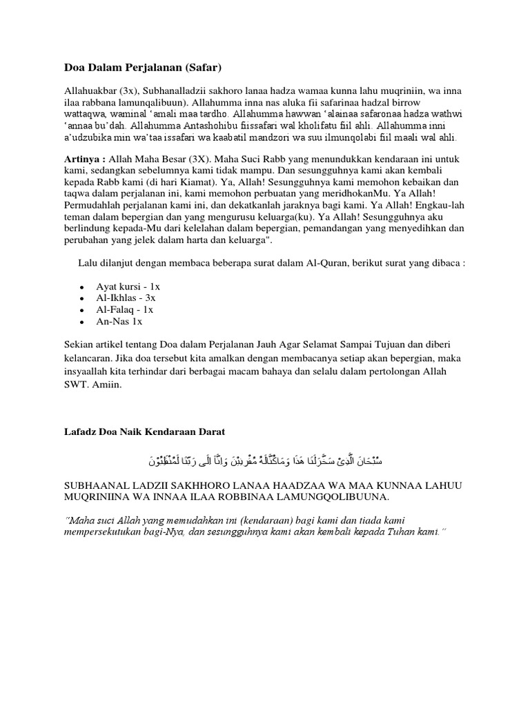 Dan solusi untuk itu semua adalah dengan mengamalkan doa safar yaitu doa yang dibaca ketika dalam perjalanan baik jauh maupun dekat. Sekian artikel tentang doa dalam perjalanan jauh agar selamat sampai tujuan dan diberi kelancaran. Doa dalam perjalanan jauh dan ketika bepergian agar selamat agustus 2 2017 agustus 4 2017 oleh khamid doa perjalanan jauh islam adalah agama sempurna yang mengatur dan mengajarkan berbagai hal termauk saat kita sedang bepergian dan melakukan perjanalan jauh safar.